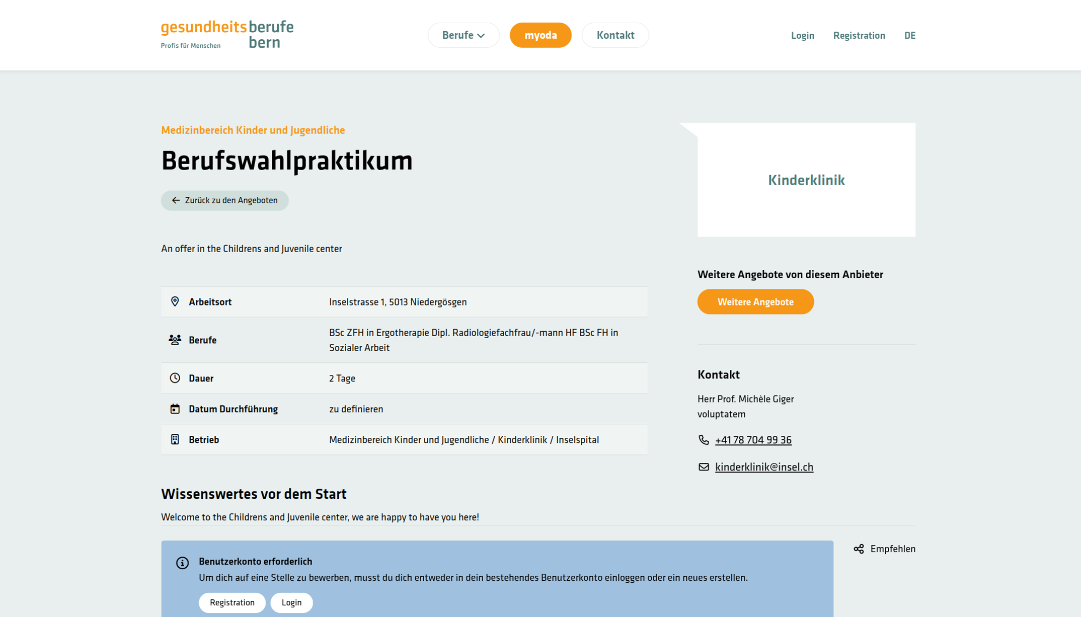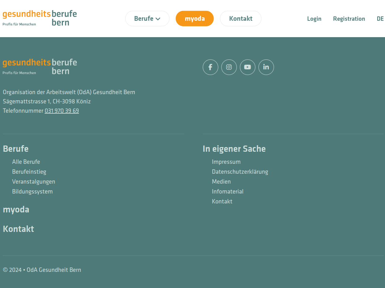 Die Organisation der Arbeitswelt (OdA) Gesundheit Bern fördert die Berufsbildung im Gesundheitswesen des Kantons Bern. Sie bietet umfassende Informationen zu Gesundheitsberufen, unterstützt bei der Berufswahl und vermittelt Ausbildungsplätze. Mit der Plattform myoda ermöglicht sie Einblickstage und Praktika, um Interessierten praxisnahe Erfahrungen zu bieten. Zudem organisiert die OdA Gesundheit Bern Veranstaltungen wie den Kantonalen Tag der Gesundheitsberufe und beteiligt sich an Messen wie der BAM, um den Nachwuchs für Gesundheitsberufe zu begeistern.