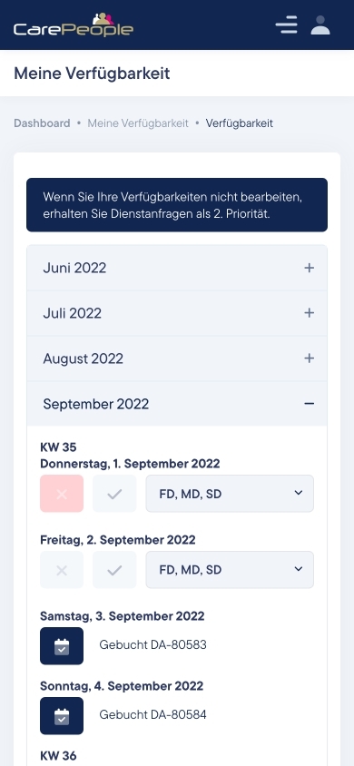 CarePeople AG wünschte sich eine eigene webbasierte und anwenderfreundliche Plattform, um alle Dienstanfragen an einem Ort verwalten zu können: Anfragen sollen über das Tool an verfügbare Mitarbeitende schnell und einfach per SMS oder E-Mail verschickt werden. Mitarbeitende von CarePeople AG haben jederzeit Zugriff auf die Dienstanfragen, können die detaillierten Informationen zum Einsatz abrufen und die angefragten Dienste annehmen oder ablehnen.