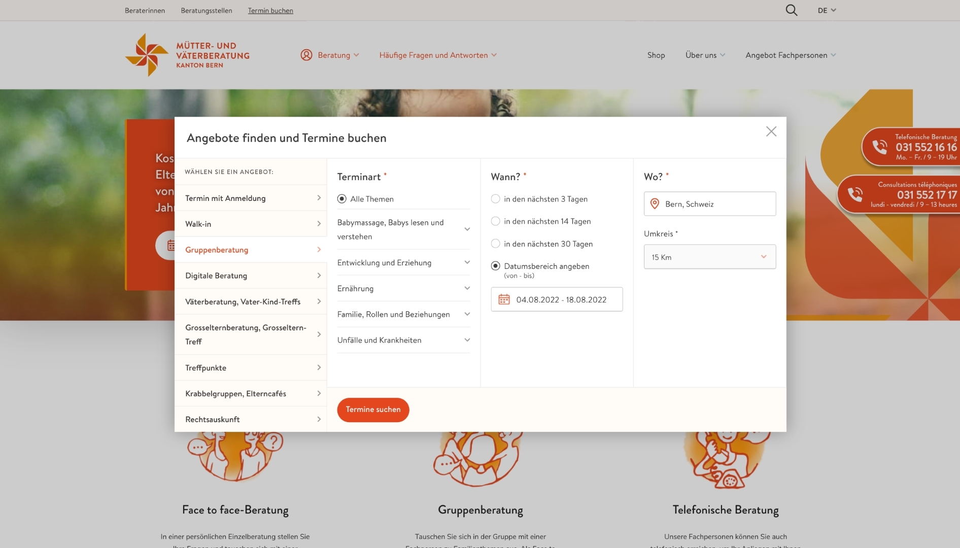 Die Koordination von 270 Standorten mit unterschiedlichen Öffnungszeiten, sowie die für die Beratung zuständigen 125 Beraterinnen mit unterschiedlichen Verfügbarkeiten, ist eine mathematische Herausforderung. Nur durch die digitale Verdichtung dieser Informationen können die unterschiedlichen Terminarten in Echtzeit für die online Buchung durch Eltern auf der Website angeboten werden.