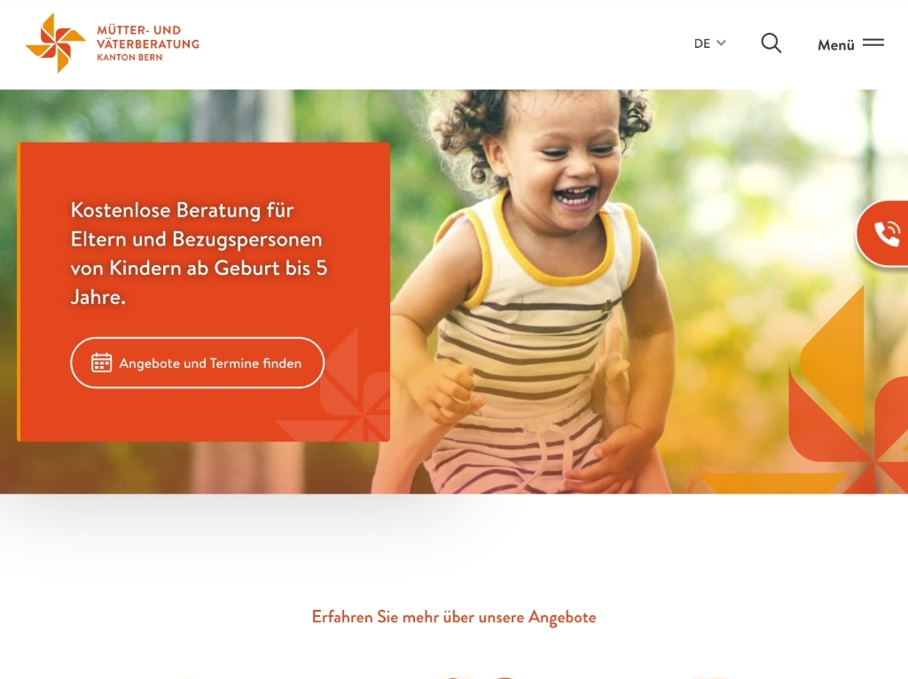 Die Mütter- und Väterberatung des Kanton Bern ist eine Fachstelle, die im Bereich der frühen Kindheit tätig ist. Sie richtet sich an Familien mit Kindern ab Geburt bis zum vollendeten 5. Lebensjahr. Die Fachstelle bietet kostenlose face-to-face, digitale, telefonische und Gruppenberatungen zu verschiedenen Themen an. Der Kanton Bern verfügt über 270 Beratungsstellen in fünf verschiedenen Regionen mit über 125 Mitarbeitenden. Sie erbringen diese Dienstleistungen im Auftrag der Gesundheits- und Fürsorgedirektion des Kantons Bern.