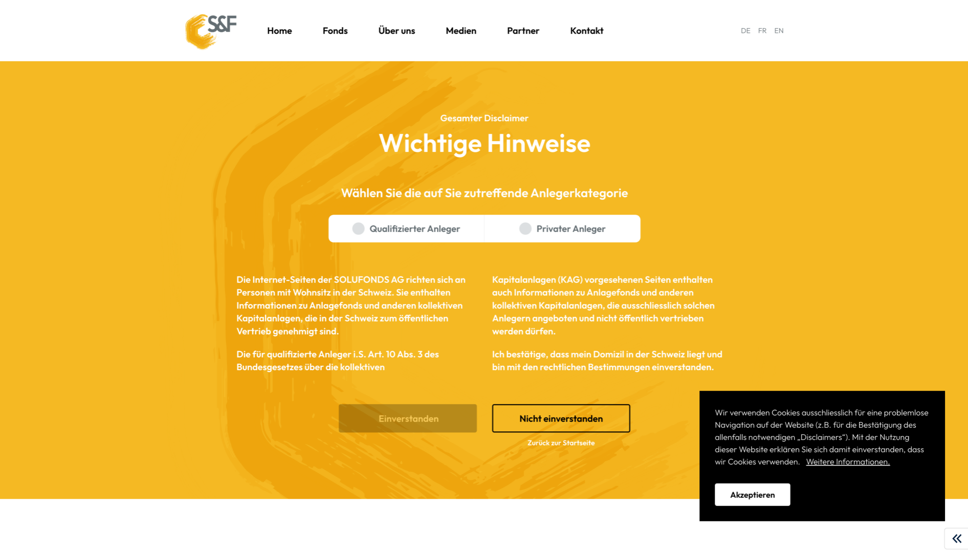 Das Herzstück der Webseite bildet das Fonds Directory, in welchem die von Solufonds verwalteten Fonds zur Einsicht bereitstehen. Zu jedem Fond wird ausführlich Auskunft gegeben. Um Zugang zu diesem Directory zu erhalten, müssen die Kund*innen zuerst die rechtlichen Richtlinien akzeptieren. Dieser Prozess wurde von cloudtec über Session-Cookies gelöst um auf technischer Ebene einen einwandfreien Ablauf zu garantieren.